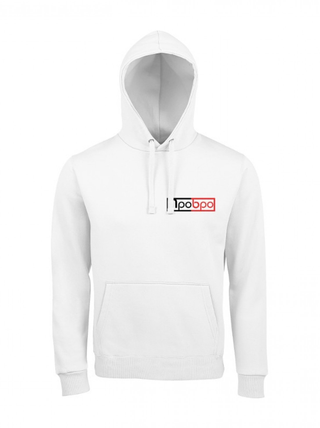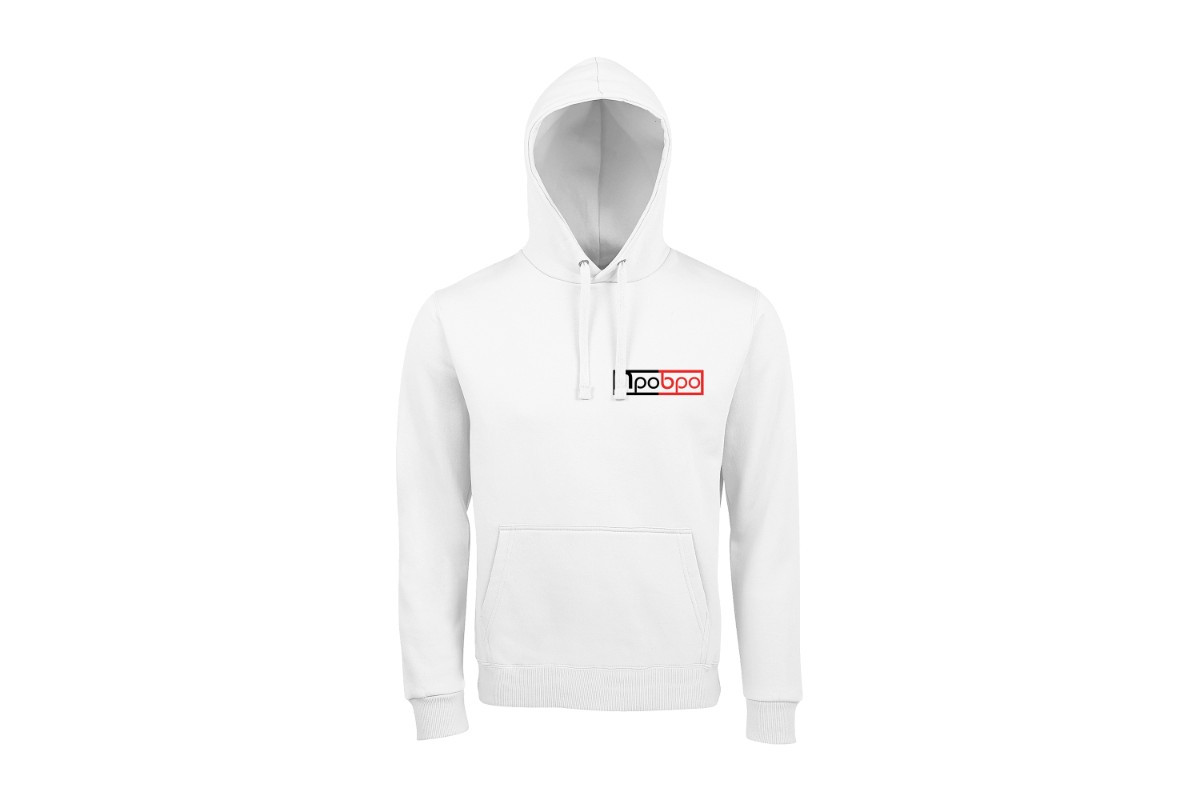 Unisex худи блогера ПроБро. На передней части худи, слева, в районе груди размещен принт - логотип ПроБро, размером 15 x 4,1 см, на задней части худи, размещен принт - “Пбрроо”, размером 27 х 14,5 см. Принт нанесен пленкой. Данный принт выдерживает 40 стирок, при условии, если стирать худи при температуре не выше 30 градусов и не использовать сушилку. Имеется два цветовых варианта худи: черная (принт - бело красный) и белая (принт - черно красный). Примечание, фотографии товара - компьютерная визуализация.