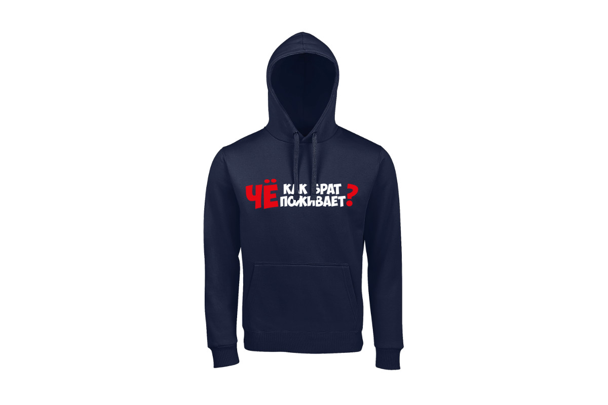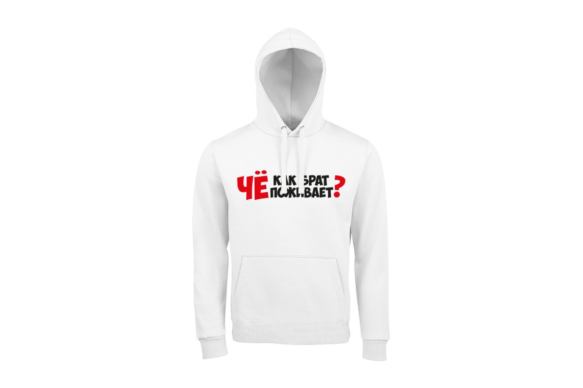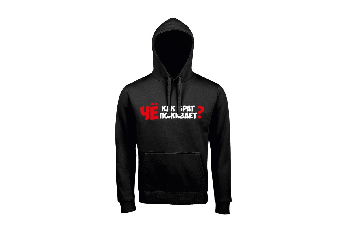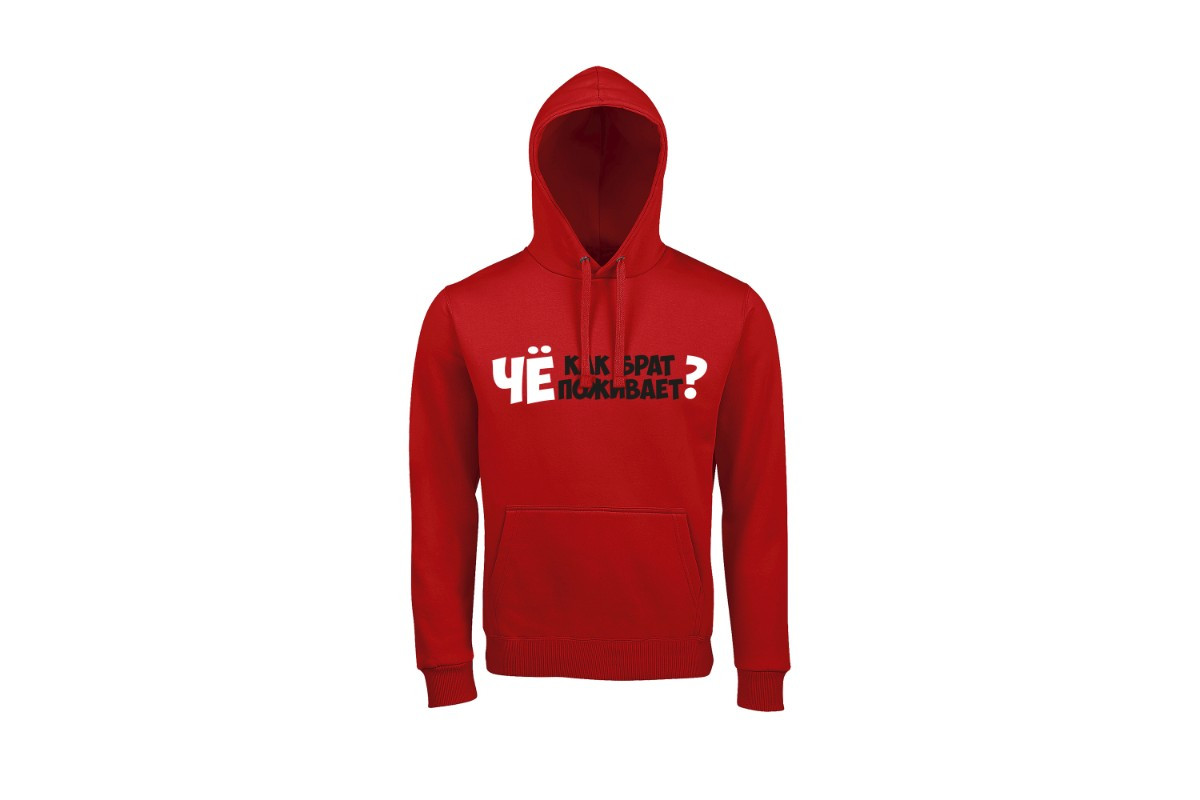 Unisex худи блогера ПроБро. На передней части худи, в районе груди размещен принт - “Чё как брат поживает?”. Принт нанесен пленкой. Данный принт выдерживает 40 стирок, при условии, если стирать худи при температуре не выше 30 градусов и не использовать сушилку. Имеется четыре цветовых варианта худи: черная (принт - бело красный), french navy (принт - бело красный), белая (принт - черно красный) и красная (принт - черно белый). Примечание, фотографии товара - компьютерная визуализация.
