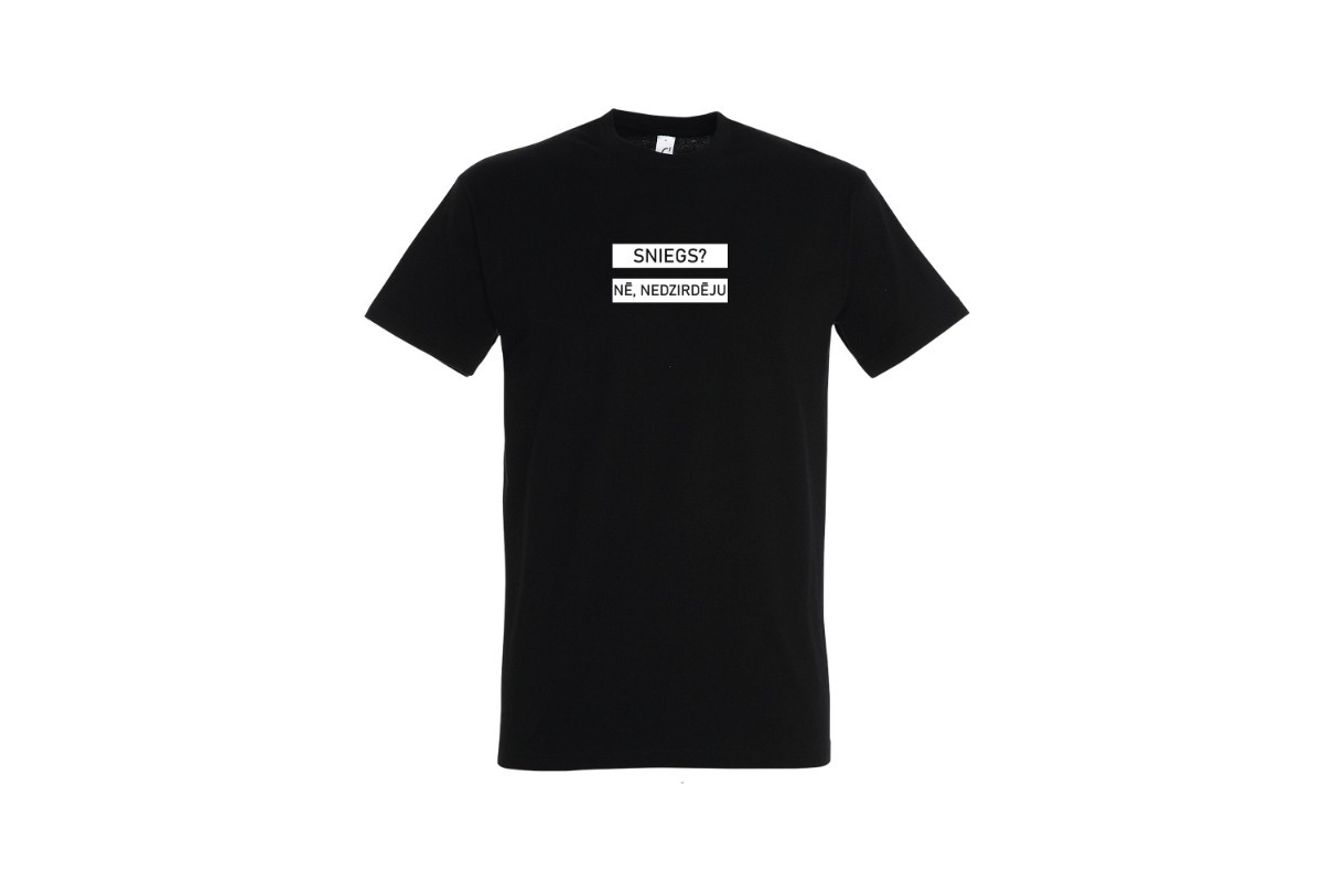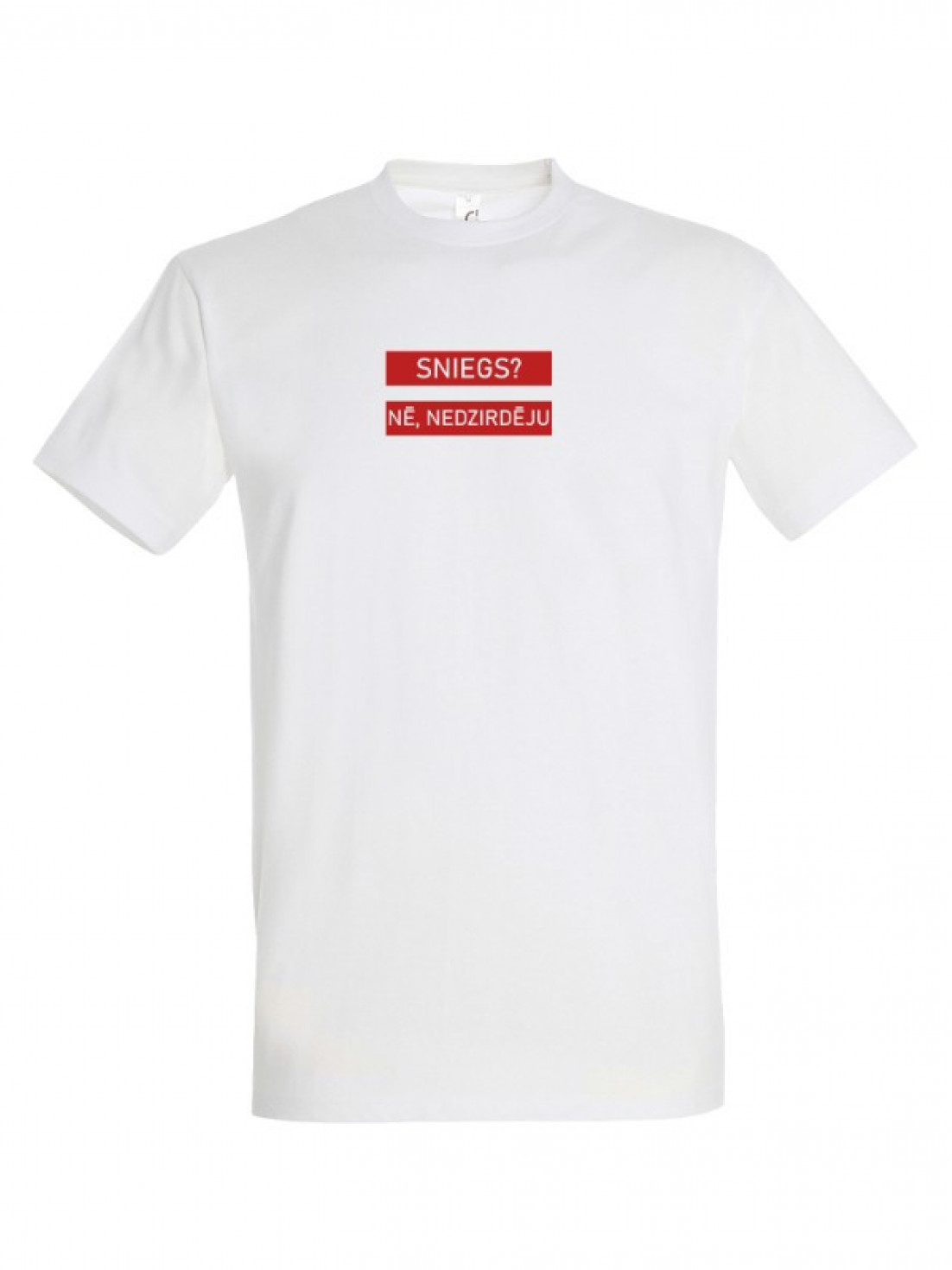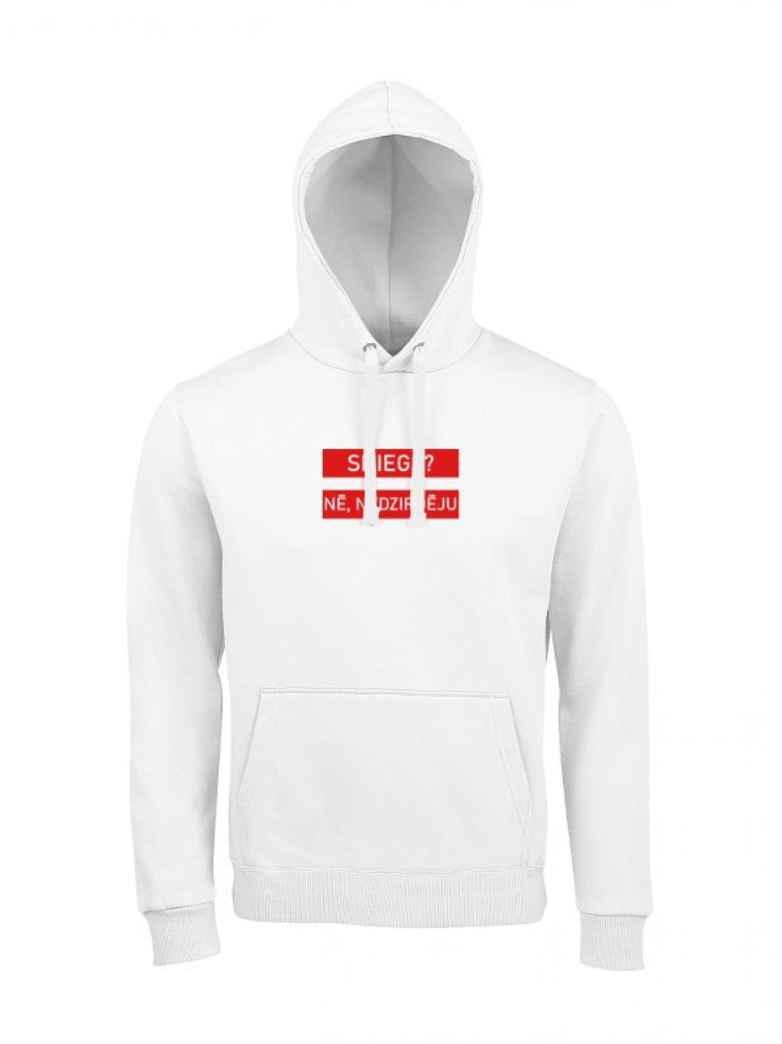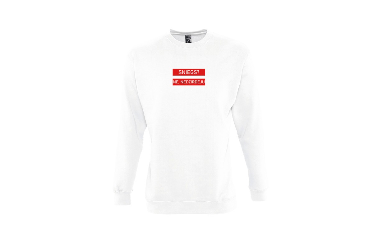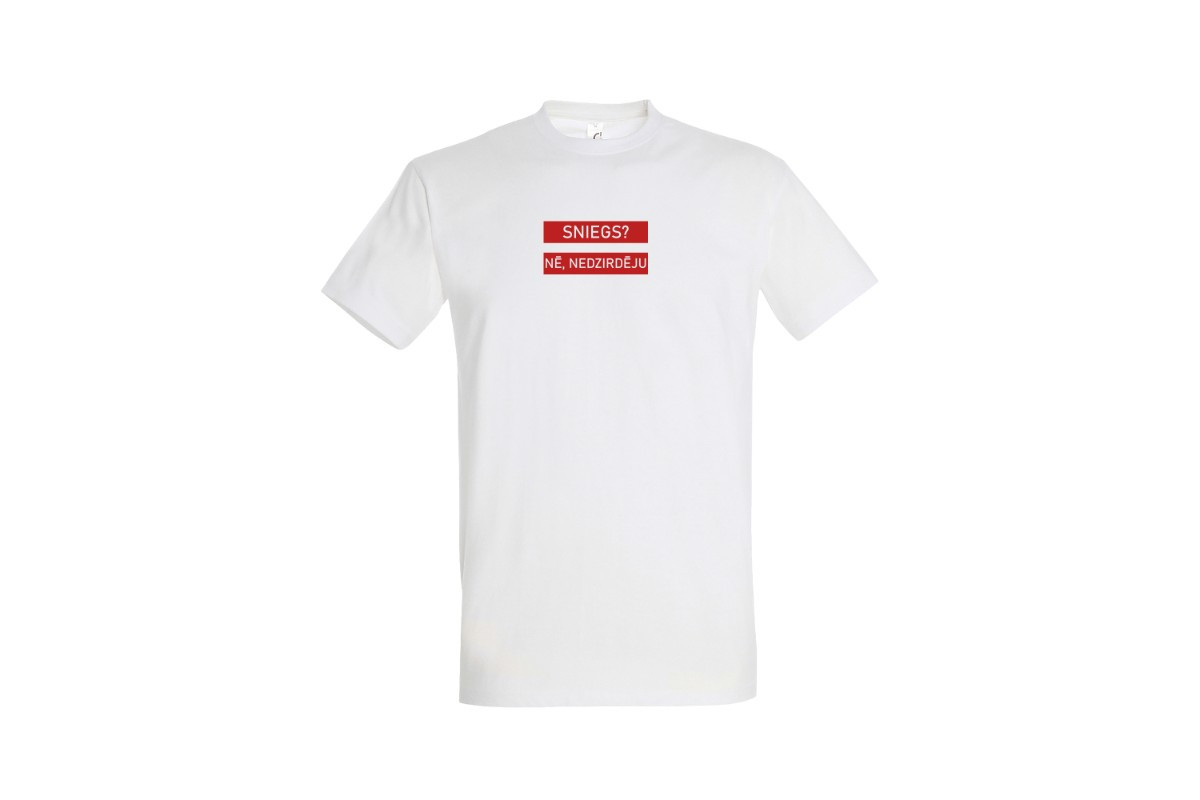На передней части товара, нанесен принт "Sniegs? Nē, nedzirdēju", пленкой. Данный принт выдерживает 40 стирок, при условии, если стирать товар при температуре не выше 30 градусов и не использовать сушилку. Имеется 3 варианта товара: Unisex майка, Unisex свитшот и Unisex худи. Имеется 3 варианта цвета товара: черный (принт белый), красный (принт белый) и белый (принт красный).