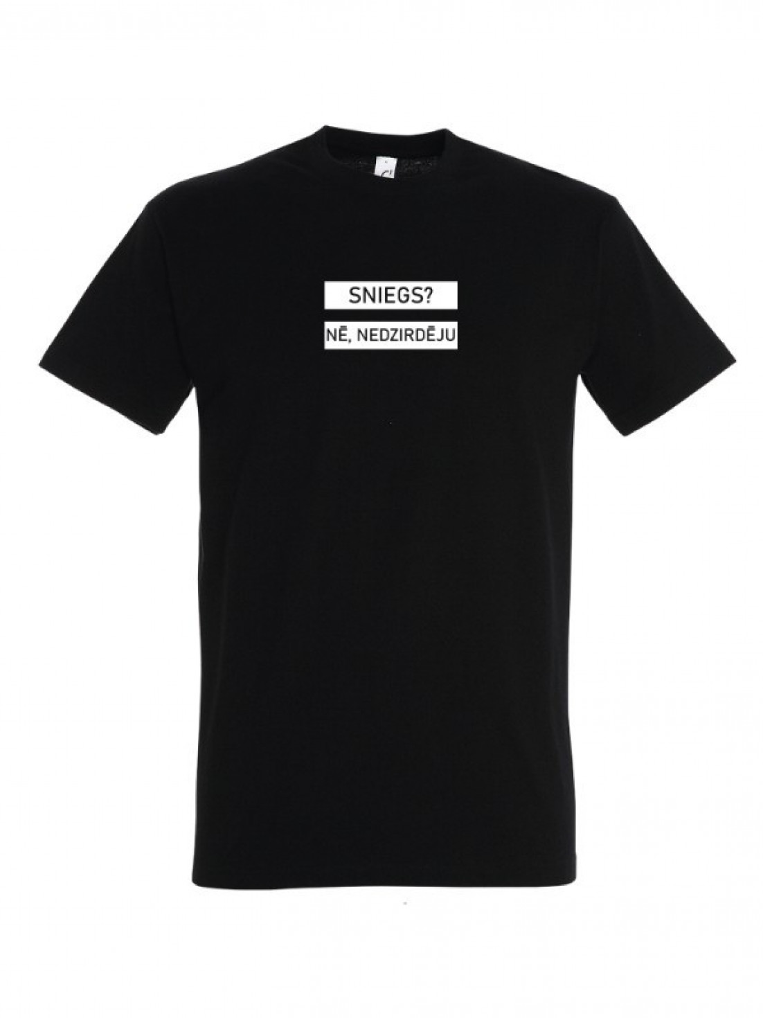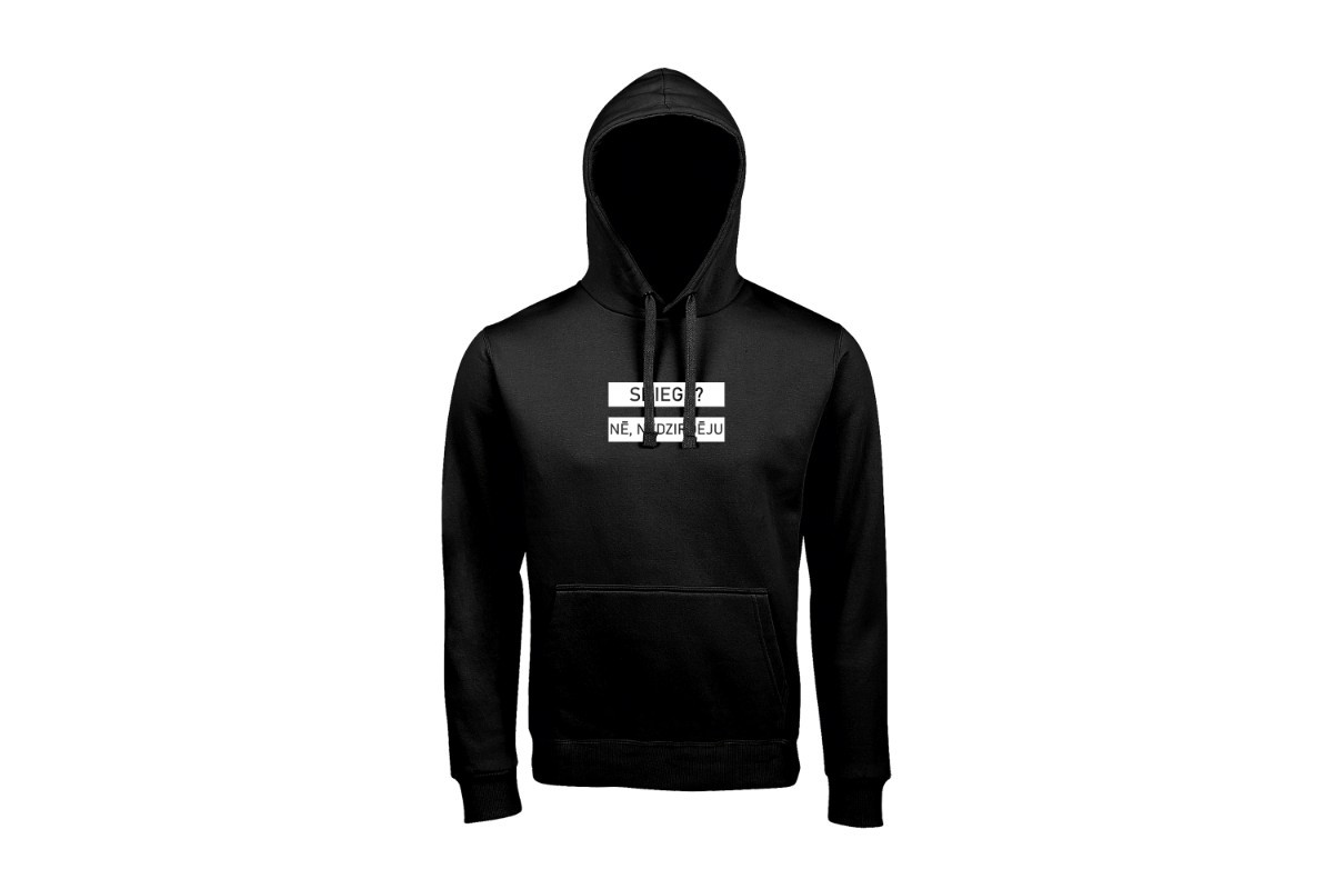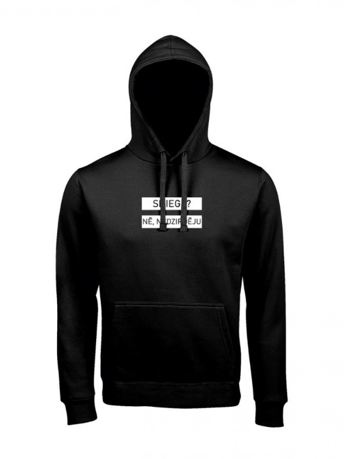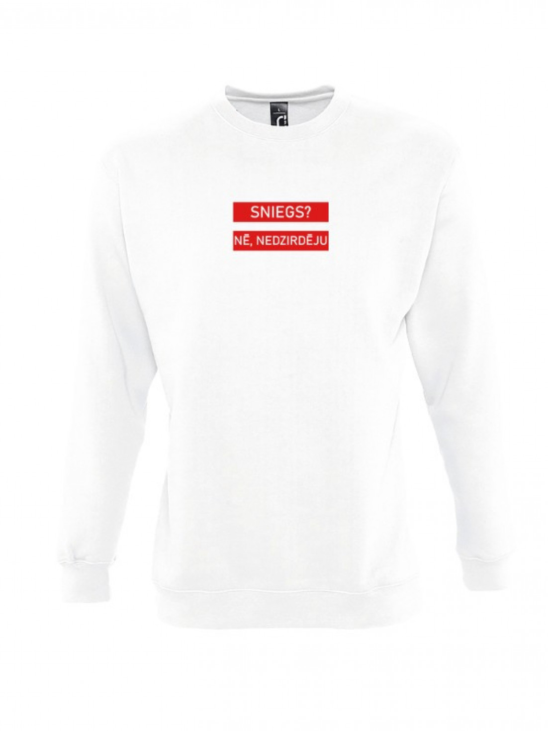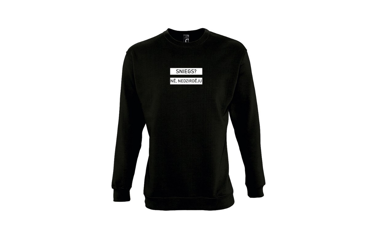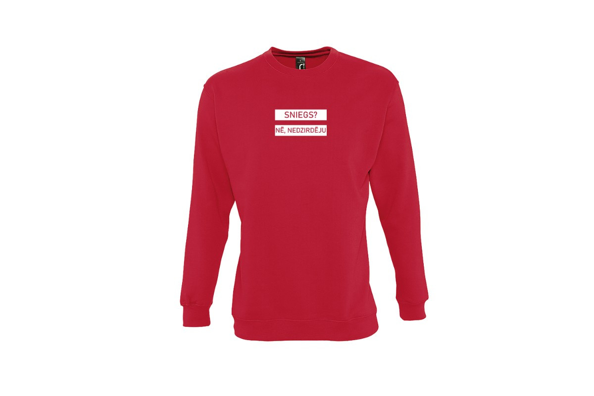 На передней части товара, нанесен принт "Sniegs? Nē, nedzirdēju", пленкой. Данный принт выдерживает 40 стирок, при условии, если стирать товар при температуре не выше 30 градусов и не использовать сушилку. Имеется 3 варианта товара: Unisex майка, Unisex свитшот и Unisex худи. Имеется 3 варианта цвета товара: черный (принт белый), красный (принт белый) и белый (принт красный).