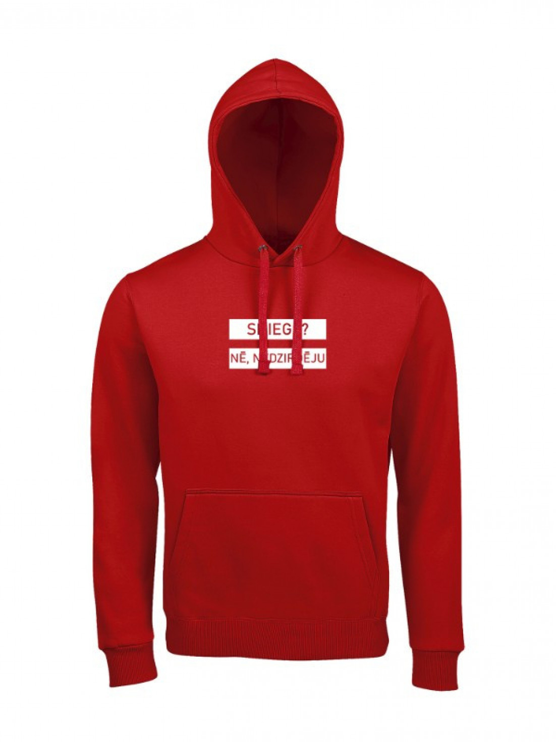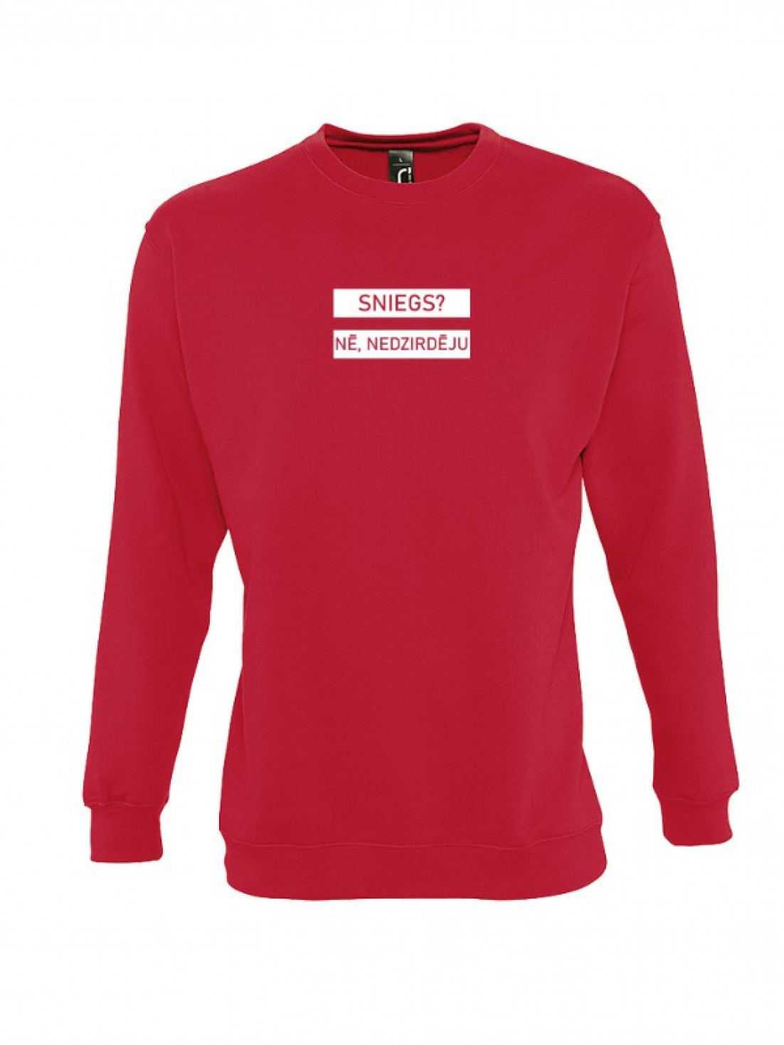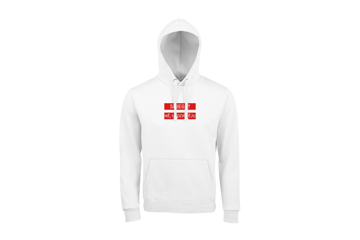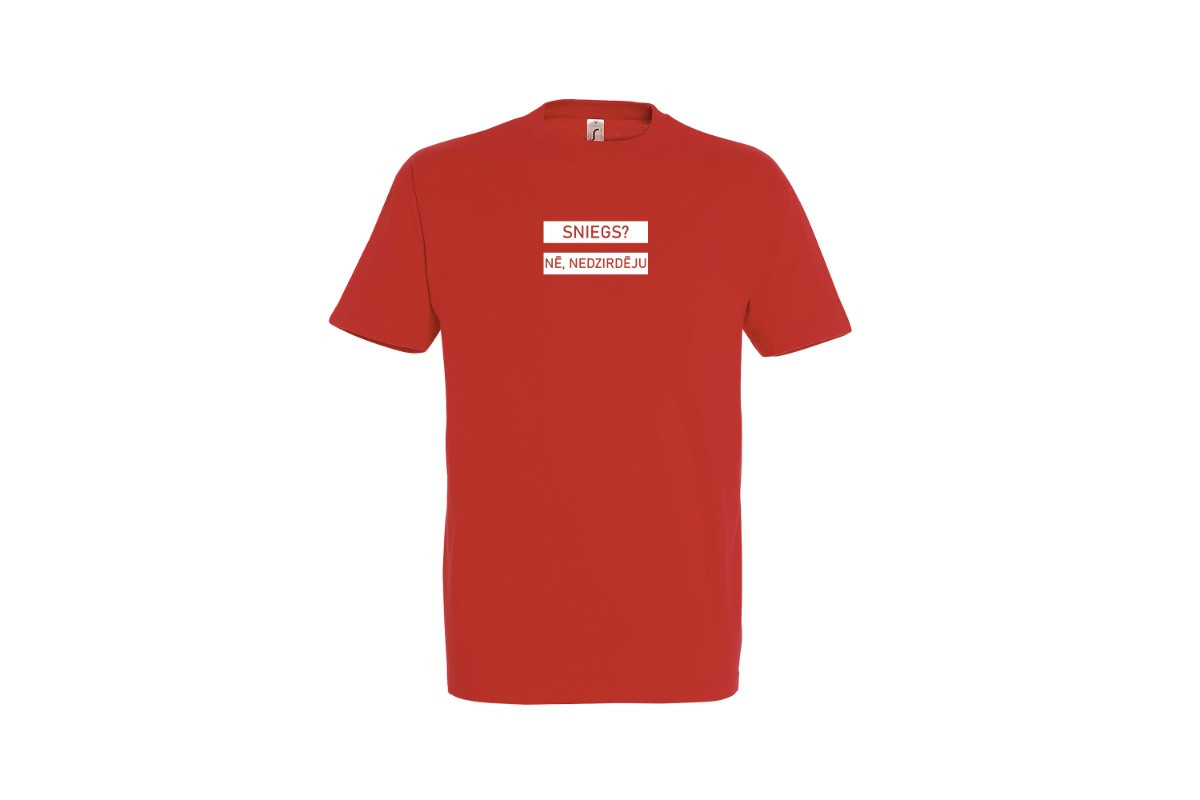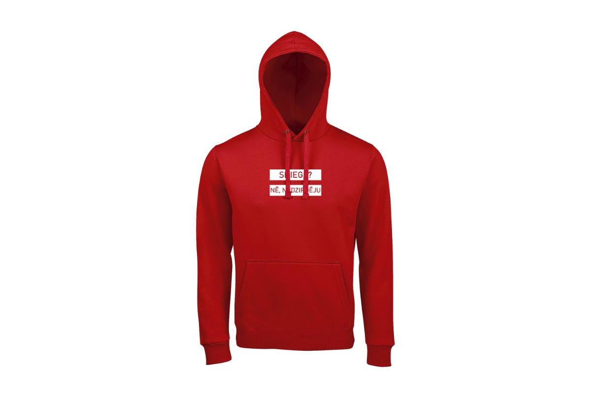 На передней части товара, нанесен принт "Sniegs? Nē, nedzirdēju", пленкой. Данный принт выдерживает 40 стирок, при условии, если стирать товар при температуре не выше 30 градусов и не использовать сушилку. Имеется 3 варианта товара: Unisex майка, Unisex свитшот и Unisex худи. Имеется 3 варианта цвета товара: черный (принт белый), красный (принт белый) и белый (принт красный).